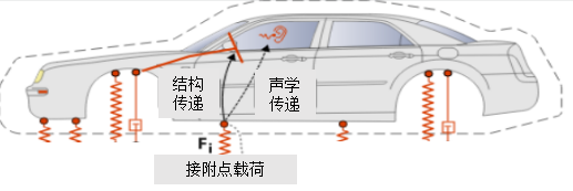 表示通过空气传递到目标点k的贡献量;n和p分别表示结构传递和空气传递的路径数。TF表示传递路径到目标点的传递函数,F表示结构传递路径处的结构载荷,Q表示空气传递路径处的声学载荷。因此,通过上式可以确定某一条路径对目标点的影响程度以贡献量,贡献量的大小可帮助工程师快速判断出关键路径。通过上式,可以确定TPA分析时需要传递函数和载荷。而载荷通常不可进行直接测量,绝大多数情况是通过间接方法测试计算得到;而传递函数通过定义完整的路径,包括结构传递和空气传递路径,需要单独进行计算;通过分析载荷和传递函数进行TPA计算,进而通过贡献量识别工程问题点和优化方案。