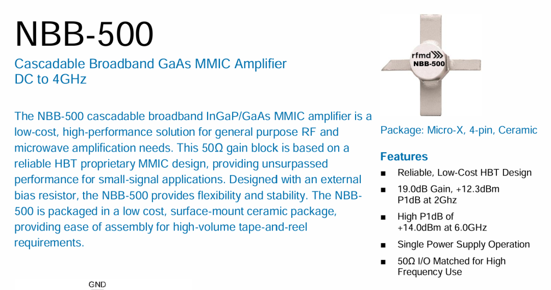 在噪声敏感场景,如雷达接收前端,低噪声放大器(LNA)就像一位安静的守护者,成为核心器件的不二之选。以 Qorvo 的 NBB500 模块为例,其噪声系数仅 3.2dB,内部集成 50Ω 匹配网络,无需额外匹配电路即可实现宽频稳定,就像一位自带稳定器的高手,在复杂的环境中也能保持出色的表现。