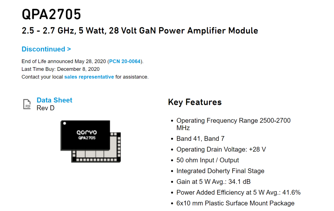 以 QPA2705 模块为例,这款基于 GaN 工艺的 Doherty 功率放大器模块,在 2.6GHz 频段展现出了卓越的性能。其副放大器能够提供 27dBm 的输出功率,效率高达 65% ,就像一台高性能的发动机,能够高效地输出强大的动力。而主放大器则采用 AB 类偏置,静态电流设置为 50mA ,在保证线性度的同时,也维持了较高的效率。通过这种精心的器件选型和偏置策略,整个模块在平均功率点(回退 6dB)的效率成功提升至 55% ,为系统的高效运行提供了有力保障。