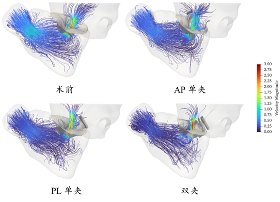 K-Clip 是我国自主研发的创新性经导管三尖瓣瓣环成形术器械,可用于治疗三尖瓣反流。本研究基于一例患者术前 CT 建立病人特异性右心模型,利用 LS-DYNA 模拟术前及3种植入策略(前-后叶间单夹、后-隔叶间单夹、双夹),并结合浸没边界法进行全心动周期流固耦合仿真,最后在 Fluent 中补充分析舒张期血流动力学。结果显示,K-Clip 可显著减小反流口面积(双夹 58.12%、后-隔叶间单夹 34.31%、前-后叶间单夹 16.36%),反流量由术前 53.54 mL 降至 17.93 mL(双夹),且术后舒张期平均跨瓣压差均小于1 mmHg,狭窄风险低。结论表明,K-Clip 修复效果显著且安全性良好,双夹效果优于单夹,后-隔叶间位置优于前-后叶间位置。