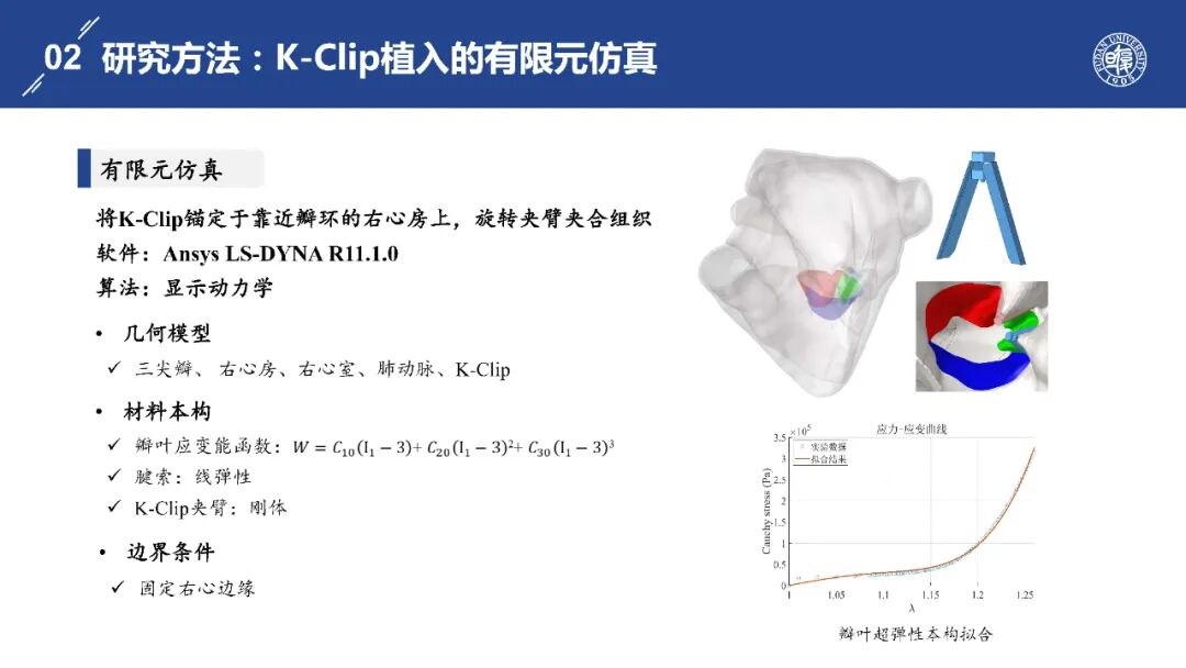 基于LS-DYNA和Fluent,本研究完成了不同数量及位置K-Clip修复方案的结构仿真与血液动力学仿真,并获得了选择最佳植入策略的可靠数据。研究发现K-Clip治疗三尖瓣反流效果显著,能够大幅减少反流量,且在舒张期狭窄风险较低,安全性良好。其中,双夹方案效果最佳,后-隔叶位置优于前-后位置。数值仿真是本研究的重要工具,为医生制定手术策略提供了可靠的生物力学依据。