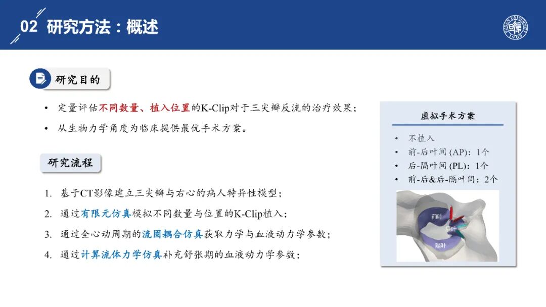 K-Clip是我国自主研发的创新性三尖瓣瓣环成形术器械,目前临床手术经验仍较为有限。作者希望通过数值仿真量化评估不同数量及位置的 K-Clip 对三尖瓣反流的修复效果,系统分析该器械对瓣膜结构与血液动力学的影响,从而为患者提供最优个性化手术方案,并总结植入策略的规律以提升术前决策的精准性。