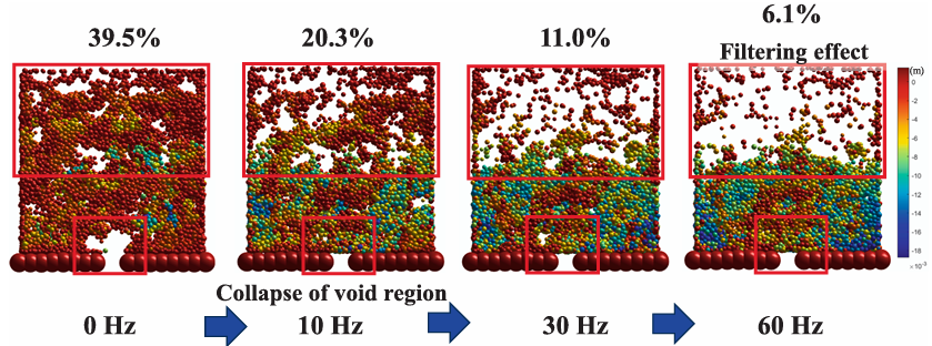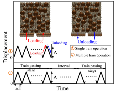 Abstract: Tunnel leakage facilitates the infiltration of sand particles into the tunnel, thereby inducing suffusion phe nomena. Furthermore, train vibrations exert substantial dynamic effects on both particle and fluid phases around the tunnel, amplifying the suffusion. This soil erosion not only compromises the tunnel’s structural stability but also elevates risks to adjacent surface structures. Nevertheless, the impact of vibration on suffusion remains incompletely understood. This study employs an improved DEM-PNM coupling framework to investigate the mechanis ms of vibration on suffusion in gap-graded soils from a microscopic perspective. A representative element-scale model replicating suffusion conditions of tunnels is developed. Vibration loads with varying am plitudes and frequencies derived from field measurements are applied to the model base. Based on this model, this study reveals the impact of vibration on suffusion and investigates its mechanis ms from four perspectives: geometric, hydraulic, mechanical conditions, and pore-scale suffusion process. Furthermore, the impact of multiple train passes on suffusion around tunnels is further explored. Results suggest that train vibration exac erbates the suffusion around tunnels, inducing a significant increase in mass loss and particle migration distance compared to static conditions. Vibration has significant impacts on the geometric, mechanical, hydraulic con ditions, and pore clogging states of soil. Higher frequencies and amplitudes result in more mass loss. Suffusion intensifies whenever the train passes, indicating that the long-term risks of suffusion to shield tunnels under vibration. This study gives critical insights into train vibration-driven suffusion for urban underground infrastructure.
