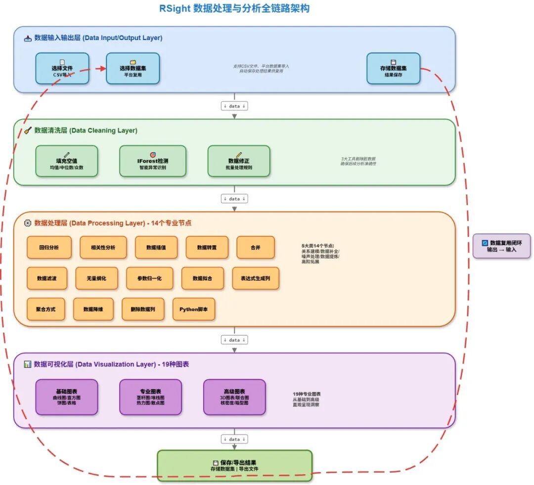 ROMTEK仿智融合数据管理及分析软件——RSight(无量)的数据处理模块的核心竞争力,不在于提供了多少个节点,而在于通过"可视化流程编排+四层架构设计+闭环数据复用",把专业数据处理从"工具的简单拼凑"升级为"系统化的价值生产线。