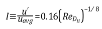 湍流强度I被定义为脉动速度的均方根与平均流速的比值(--高等流体力学 归柯庭 钟文琪 编)。对于内部流动,气流充分发展时公式如下: