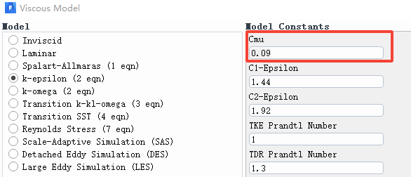 其中L为特征长度,与管道尺寸相关,Cμ是k-e湍流模型的一个常数项系数,一般默认值为0.09。此系数可在Fluent k-e湍流模型中查询到。