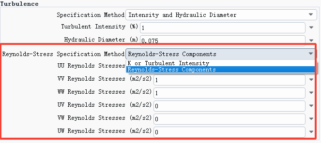 当湍流模型为雷诺应力模型(RSM)时,边界湍流参数会多出来雷诺应力分量Reynolds Stress Components的设置。