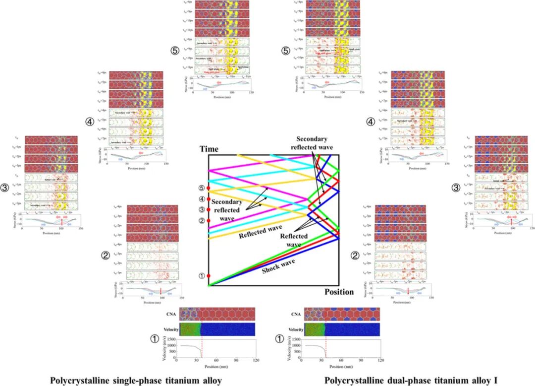 The shock-induced multi-spall processes of nanocrystalline titanium alloys were simulated based on molecular dynamics method in this study to reveal the multi-spall damage mechanis m caused by non-planar effect of shock wave induced by microscopic interface. The microscopic interface in nanocrystalline titanium alloys caused non-planar effect of shock wave propagation and hindered shock wave propagation. The shapes of non-planar shock wave in nanocrystalline dual-phase titanium alloys were affected by the distribution of second phase grain. Based on the relationship between the evolution law of tensile stress and the nucleation principle of multi-spall voids, it was found that the multi-spall voids nucleated at microscopic interface under tensile stress generated by the encounter between the secondary reflected wave and the reflected wave for the first time. The non-uniform distribution of tensile stress generated by the encounter between the non-uniform propagation reflected waves led to the non-uniform distribution of multi-spall voids at microscopic interface. The increase of dislocation density caused by second phase grain hindered the secondary void nucleation in nanocrystalline dual-phase titanium alloys, resulting in the difference in secondary void nucleation between nanocrystalline single-phase titanium alloy and nanocrystalline dual-phase titanium alloys. The damage rate (D˙) at the spall stage and strain rate (ε˙) at the shock stage were positively correlated and followed the relationship: D˙=aε˙b (a and b were fitting parameters and related to the microstructure of material and shock conditions). The multi-voids still nucleated at microscopic interfaces and the intergranular spall occurred in nanocrystalline titanium alloys although the shock velocity increased.