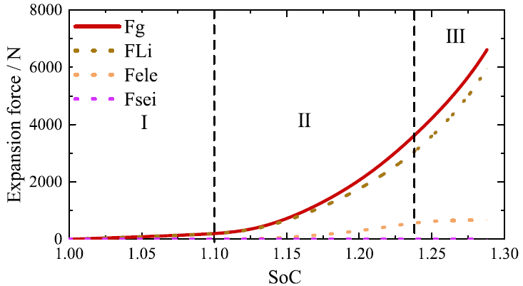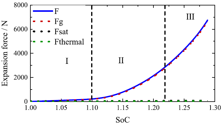 在泄压之前(阶段 I、II、III),由于温度始终低于70°C ,热膨胀力( )和电解液蒸气压力( )贡献微乎其微,几乎可以忽略不计。