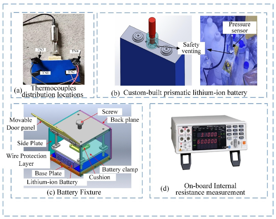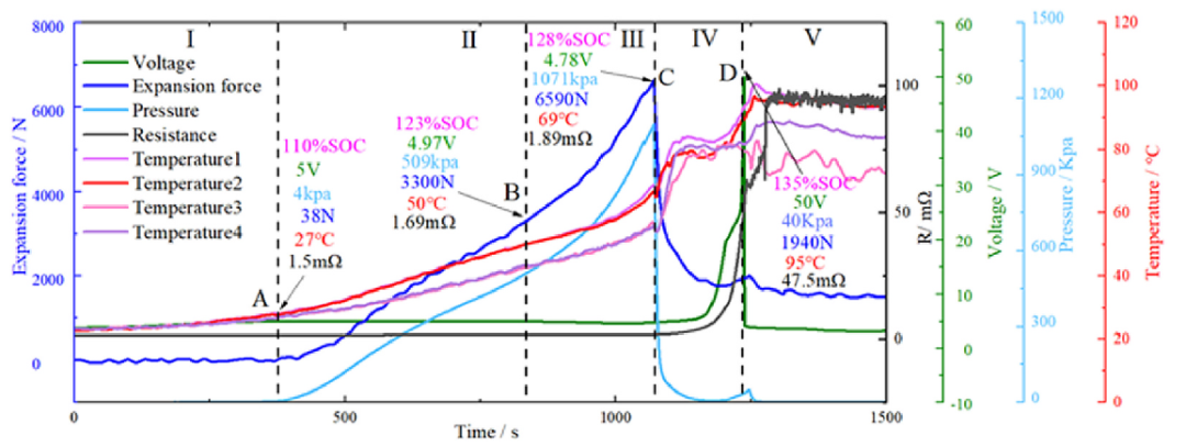通过这个平台,研究者得以在过充实验中,同步监测电压、温度、内阻、内部压力和外部膨胀力——这几乎是描绘电芯热失控过程所需的全套数据。