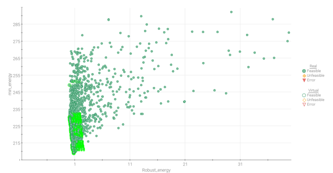 在modeFRONTIER的二维散点图中,你会看到一条由点组成的“边界线”。