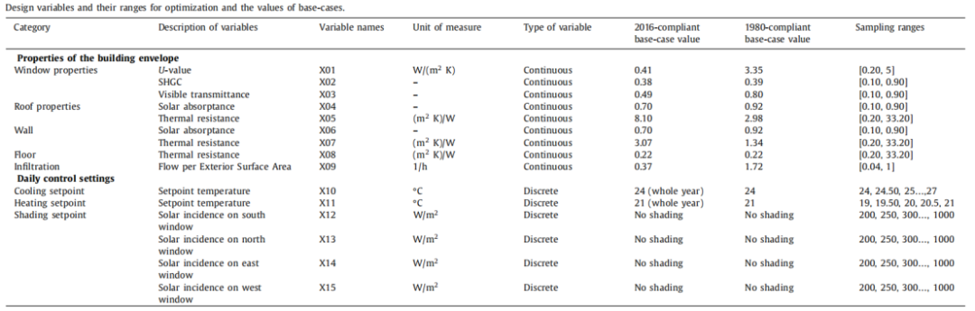 第一步:设计变量定义:涵盖围护结构热工性能和设备控制策略的15个参数: