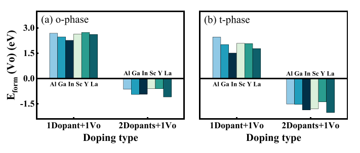 不同元素掺杂ZrO₂层在正交相与四方相超晶格中,对应不同构型(单掺杂剂+单氧空位与双掺杂剂+单氧空位)在3%掺杂浓度下的氧空位形成能