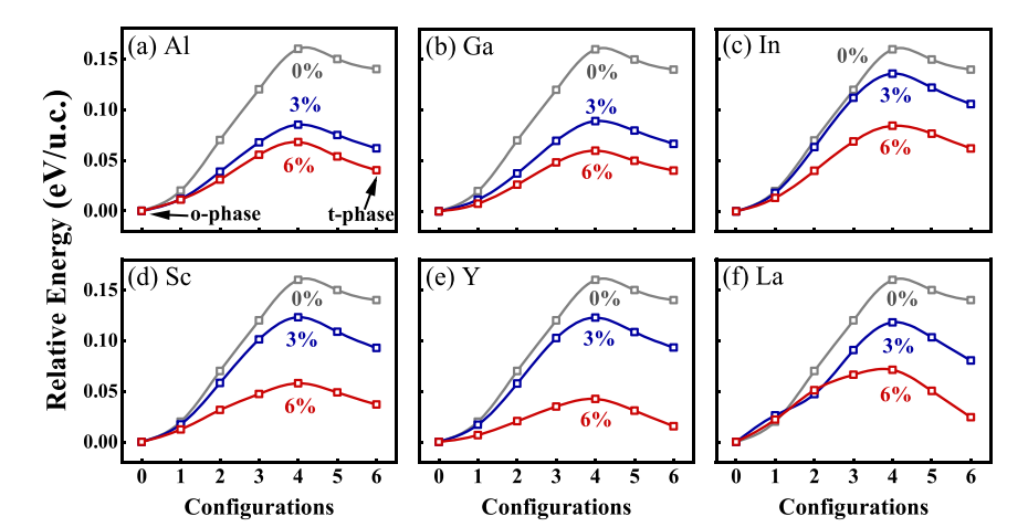 不同掺杂浓度下掺杂超晶格体系中的正交相-四方相(a中已标出)转变势垒,通过CI-NEB方法计算的相变势垒图