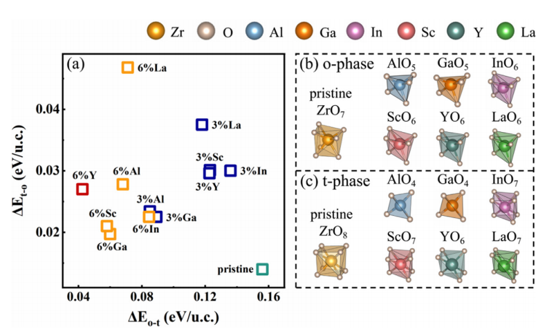 本研究采用第一性原理计算作为核心研究方法,系统地分析了掺杂HfO₂-ZrO₂超晶格体系。首先构建了HfO₂和ZrO₂交替堆叠的超晶格原子模型,分别研究了其极性正交相和非极性四方相,选取了六种三价金属元素作为掺杂剂:Al、Ga、In、Sc、Y、La。研究聚焦于它们取代ZrO₂层中的Zr原子,随后发现,当引入单氧空位并伴随双掺杂剂时,会形成最稳定的电荷平衡态,这种构型符合III族氧化物的化学计量比,显著降低了氧空位的形成能。