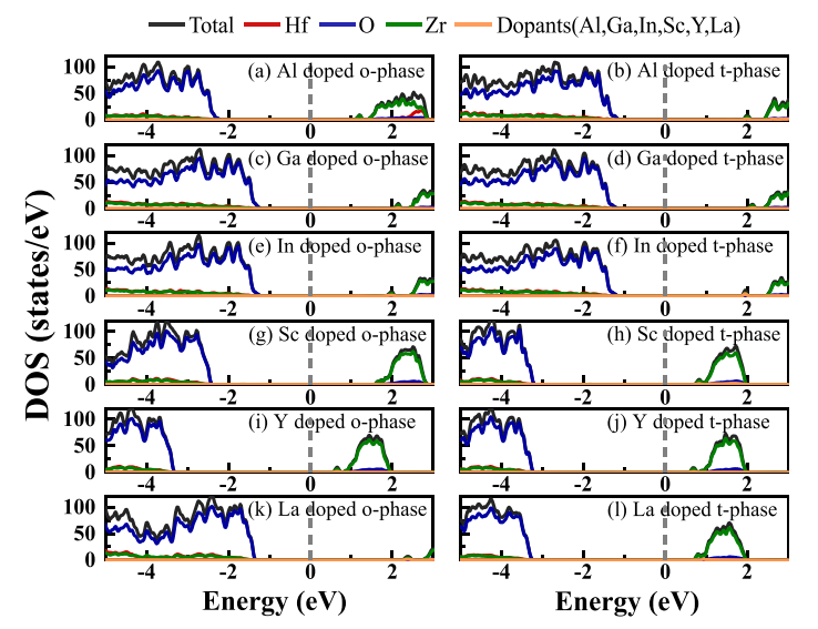 在电荷平衡状态下,分析计算了掺杂体系的电子态密度,以评估氧空位引入的缺陷态对带隙和漏电流的影响,通过分析掺杂剂周围的局部原子结构(如键长、配位数),发现这些氧空位产生的缺陷态被有效地钝化了,它们与导带底合并,没有在带隙中引入显著的中间能级,从而保持了材料的大带隙特性,在理论上可以有效抑制漏电流。