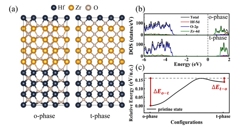 (a) 正交相与四方相的原子结构;(b) 正交相与四方相的态密度分布,费米能级以灰色虚线标示于0.0 eV处;(c) 正交相与四方相之间的相变势垒