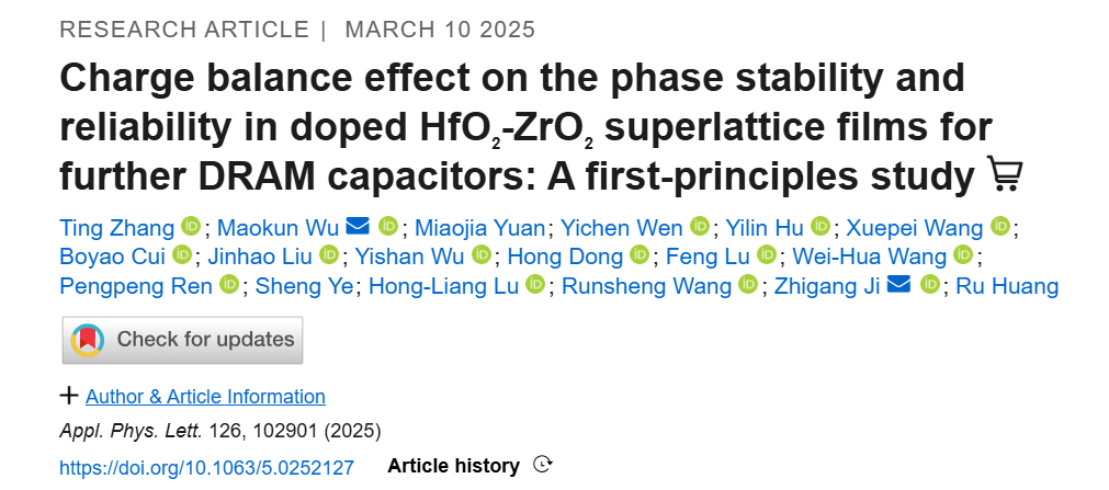 本研究提出一种在掺杂HfO₂-ZrO₂超晶格体系中通过电荷平衡效应实现MPB和低漏电流的可行方法。通过第一性原理计算证实,掺杂与氧空位的协同作用可降低极性相与非极性相之间的相变势垒,促使形成更多MPB区域。特别是Y掺杂体系,因其相变势垒最小而更具优势。此外,在电荷平衡状态下,氧空位引发的缺陷态可被钝化,从而实现扩宽禁带并抑制漏电流的作用。这项工作为开发高介电常数、低漏电流的介电材料提供了潜在解决方案,为未来3D DRAM电容器的发展铺平了道路。文章发表于《Appl. Phys. Lett.》(点击阅读原文查阅),DOI:10.1063/5.0252127