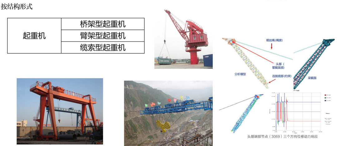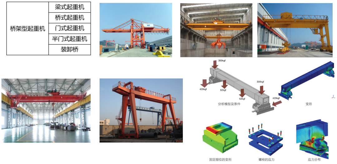 桥架型起重机分为梁式起重机,桥式起重机,门式起重机,半门式起重机,装卸桥臂架型起重机分为固定式起重机,台架式起重机,门座起重机,半门座起重机,塔式起重机,铁路起重机,流动式起重机,浮式起重机,甲板起重机,悬臂起重,机桅杆起重机