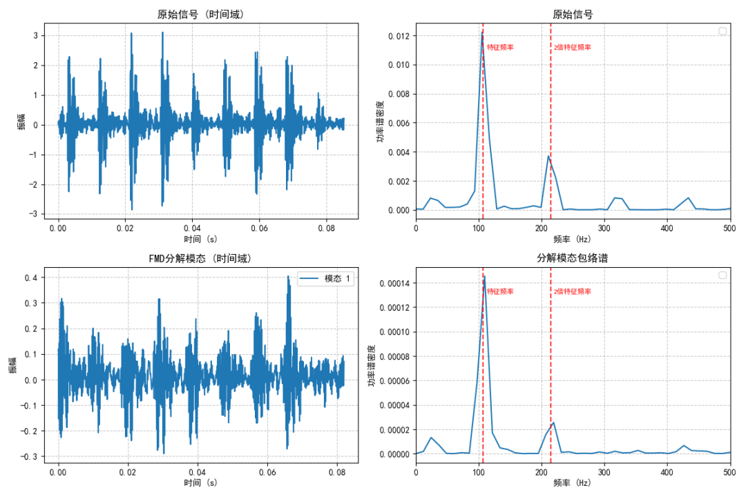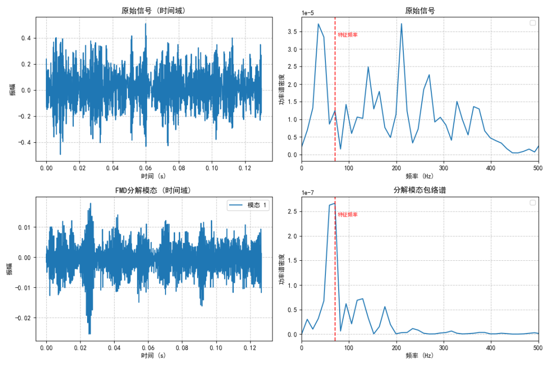 特征模态分解(FMD)正是为破解上述难题而提出,在理论层面,FMD实现了对故障信号冲击性与周期性的同步考量,无需故障周期先验知识即可实现故障特征的定向提取。在单一故障和多频段复合故障的特征提取中,均能从强干扰信号中分离出高信噪比的故障模态,其性能显著优于主流的VMD。