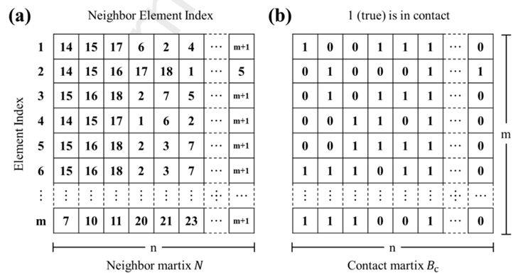 Abstract: With the growing complexity of particle-based simulations, efficient neighbor searching algorithms are crucial for improving computing performance. Conventional neighbor searching algorithms are generally based on iterative or list-based operations, which face challenges in computational speed and complexity within high-performance computing. A novel neighbor searching algorithm based on pure matrix operations is proposed in this paper. In the algorithm, all the element properties (including coordinates, radii, stiffness, etc.) are stored in arrays. A neighbor matrix can be efficiently obtained via a series of pure matrix operations, such as substitution, sorting and arithmetic calculations. The indexes of neighboring elements are recorded rows by rows in the neighbor matrix. As the number of neighboring elements varies between rows, a virtual element is introduced to fill the spaces in the neighbor matrix. Numerical tests demonstrate the consistent superiority of the proposed pure matrix algorithm over a conventional linked-list method. Across the tested range of 200 to 2,000,000 elements, the matrix-based approach maintains significantly higher computational speeds, achieving its maximum performance advantage of approximately 13 times faster. As the algorithm and further computation of particle system are based on simple matrix operations, it is highly suitable for GPU computing and subsequent particle dynamics calculations. Overall, the neighbor searching algorithm developed in this study enables efficient simulations in particle system.