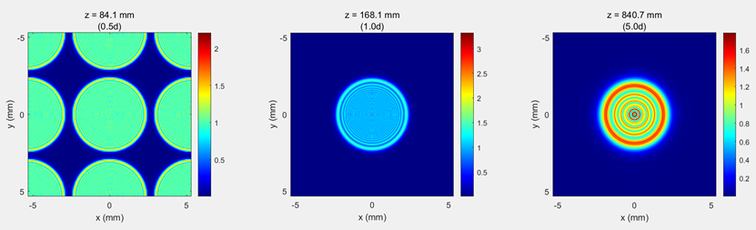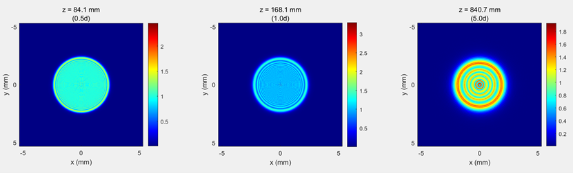 波长为 632.8 nm,衍射屏由1064pixel×1064pixel构成,抽样间隔为Δx0=Δy0=10 μm,圆孔直径等于3.5mm,d=81mm。通过对比不同传播距离下的仿真结果,我们可以系统验证算法的准确性: