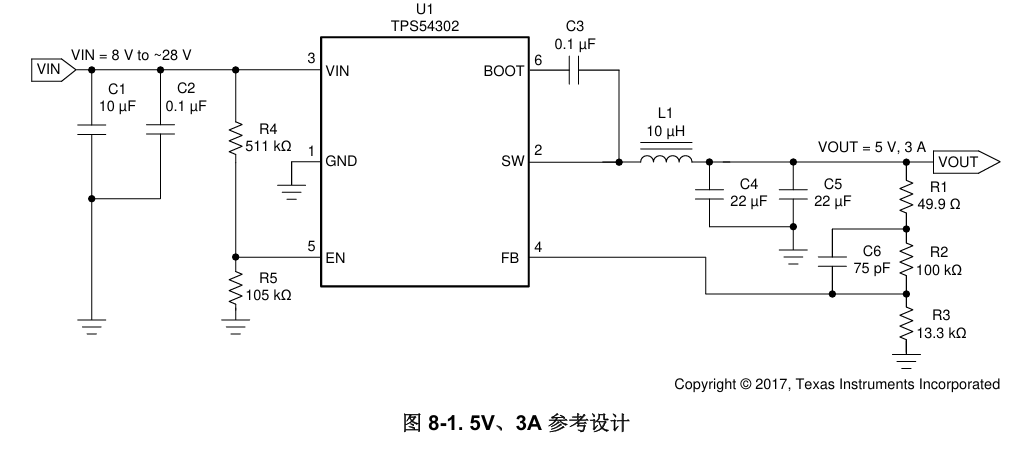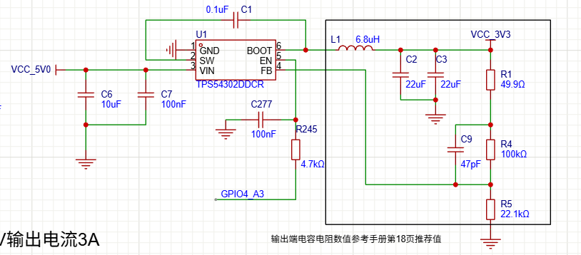 同事设计了一个5V转3.3V/3A的BUCK电源,用的TI的TPS54302,参考电路如下: