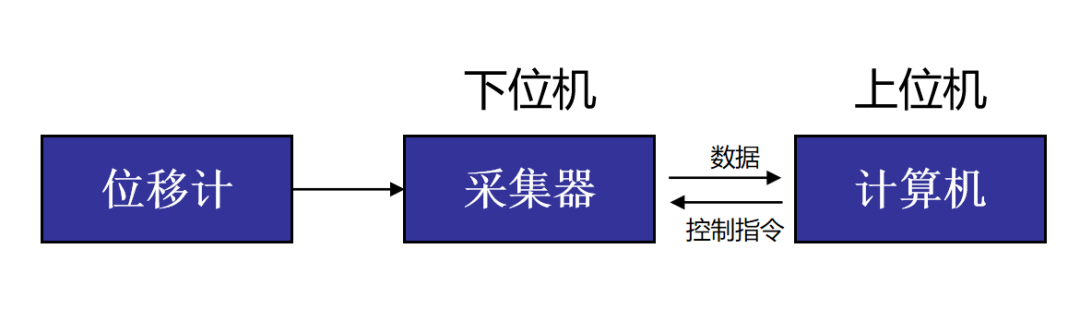 以位移为例,目前大家用的比较多的方法是将位移计接到采集器上,然后采集器和电脑连接,实时回传数据到电脑端的测控软件。流程如下: