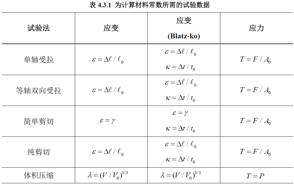 midas NFX中支持通过五种试验方法计算材料常数。五种试验方法分别为单轴受拉试验、等轴双向受拉试验、简单剪切试验,纯剪切试验、体积压缩试验。多项式模型和奥格登模型在处理体积压缩试验外的试验数据时需要假设为非压缩性材料,需注意所有数据均为工程应力和工程应变。下表4.3.1是为各试验方法计算材料常数所需的应变和应力。