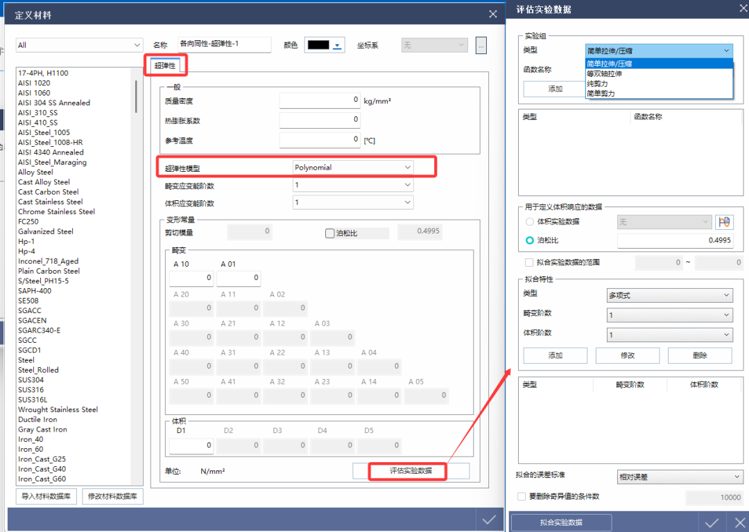 为格林张量的第1、2、3次不变量,由公式可知包含了与体积变化相关的势能。midas NFX中通过试验数据可方便的获得超弹性模型的材料常数。材料常数可使用最小二乘法(least square method)近似计算,并根据材料模型决定是使用线性还是非线性最小二乘法。