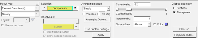 密度云图:在 HyperView 中查看设计空间的单元密度(伪密度)分布 (0~1)。密度接近 1 的区域是必须保留的“实心”结构,密度接近 0 的区域是可以去除的材料,中间值表示需要解释的过渡区域,转向节拓扑优化单元密度云图如图6和图7所示: