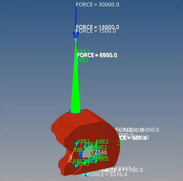 控制臂:通过 RBE2/RBE3 单元在连接点施加约束或力(取决于分析模型)。