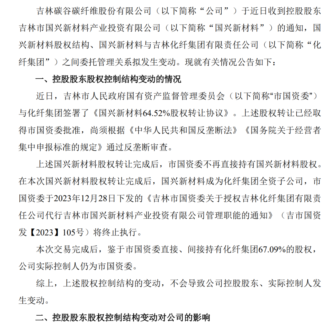 企业资讯·吉林碳谷:关于公司控股股东股权控制结构变动