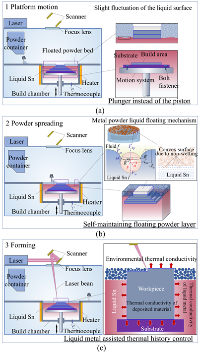图2 LMA-LPBF成型工艺示意图如图(a–c)所示,被红色虚线框所包围。在LMA-LPBF成型过程中:(a)随着零件高度增加,构建平台逐层下降;(b)粉末铺展装置将新粉末层铺展于表面;(c)激光熔化指定区域。该循环持续进行直至零件完全成型。成功制造的基础要求是:平台移动与粉末铺展过程均不得破坏液态金属上浮的粉末床完整性与平整度(a)。此外,液态金属卓越的表面张力可稳定支撑粉末床(b),从而实现经济高效的制造路径。值得注意的是,液态金属卓越的导热性可更精确控制凝固过程中微观结构的演变(c),从而为定制材料性能创造可能。