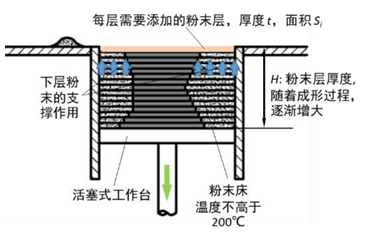 激光粉末床熔融技术(LPBF)是金属3D打印的主流工艺,但它依赖于固态粉末堆积床,即后铺设的上层粉末完全由先铺设的下层粉末及工作台支撑(图1),其代价是需要大量粉末来填充成形缸以构成粉末床。虽然未转化为零件的粉末可以被回收复用,但存在多个结构性限制: