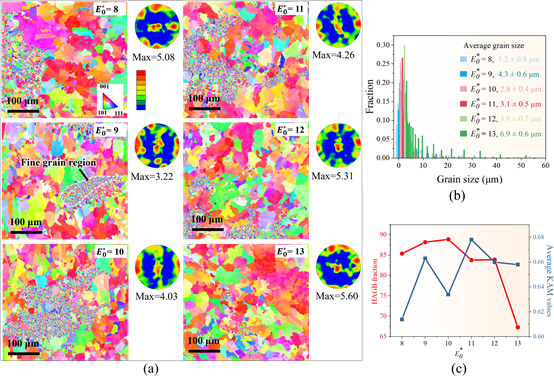 图3(a)水平截面EBSD图像显示LMA-L-PBF技术能在不同归一化等效能量密度值下调控异质结构。(b)不同E0*值对应的平均晶粒尺寸分布。(c)高角度晶界占比及KAM值随变化的趋势。
