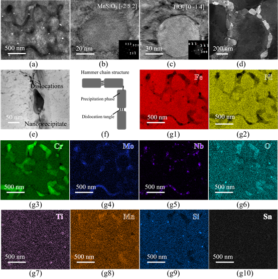 图4(a)透射电子显微镜图像及对应的(g1-g10)能谱图像显示Cr、Mo、Nb、O、Ti、Mn和Si元素向凝固细胞壁的偏析。高分辨率透射电子显微镜图像显示纳米析出物分别为:(b)MnSiO₃和(c)TiO₂。(d)暗场透射电子显微镜图像表明,MA-ASS的晶胞边界被高密度纳米相所改性。(e)沿位错晶胞壁的析出物放大视图。(f) 析出相和位错形成的“锤链”结构示意图。
