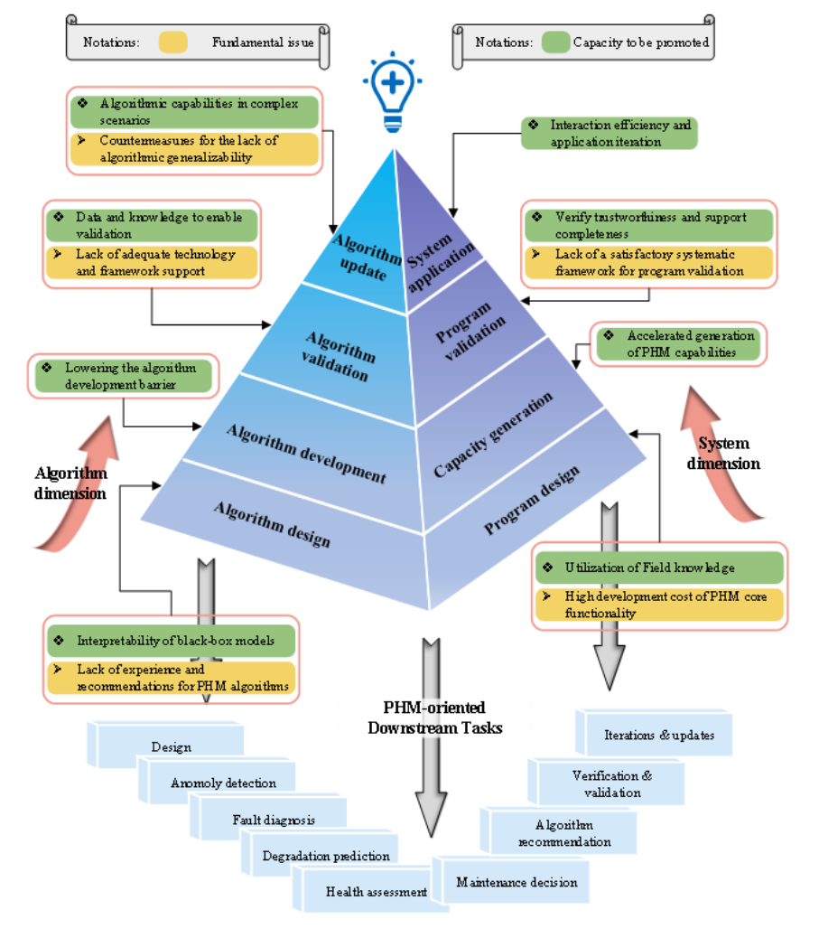 在2.1节分析的基础上,为解决PHM领域的关键问题,突破PHM的技术瓶颈,验证和提升PHM系统的能力,促进PHM领域的全面发展,本文从PHM算法和模型层和PHM系统层两个角度阐述了PHM技术仍然面临的挑战。这种方法为具有不同研究兴趣和需求的读者提供了不同层次的参考,如图2.2所示。