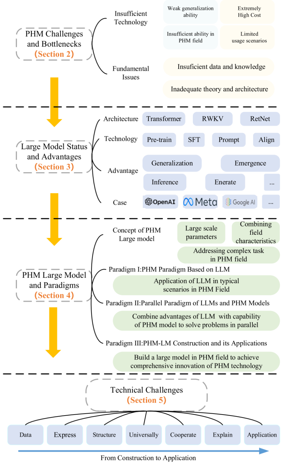 本文随后的结构如下(如图1.2所示):第二节全面评估了PHM领域的发展瓶颈和挑战。第三节分析了大模型研究现状及优势特点,并综述了相关文献。在第四节中,创新性地提出了健康管理大模型的新概念,以及未来该方向技术研究与应用进阶的三类典型创新范式。第五节讨论了健康管理大模型的部署与应用中存在的一系列关键技术和挑战。第六节进行全文总结。