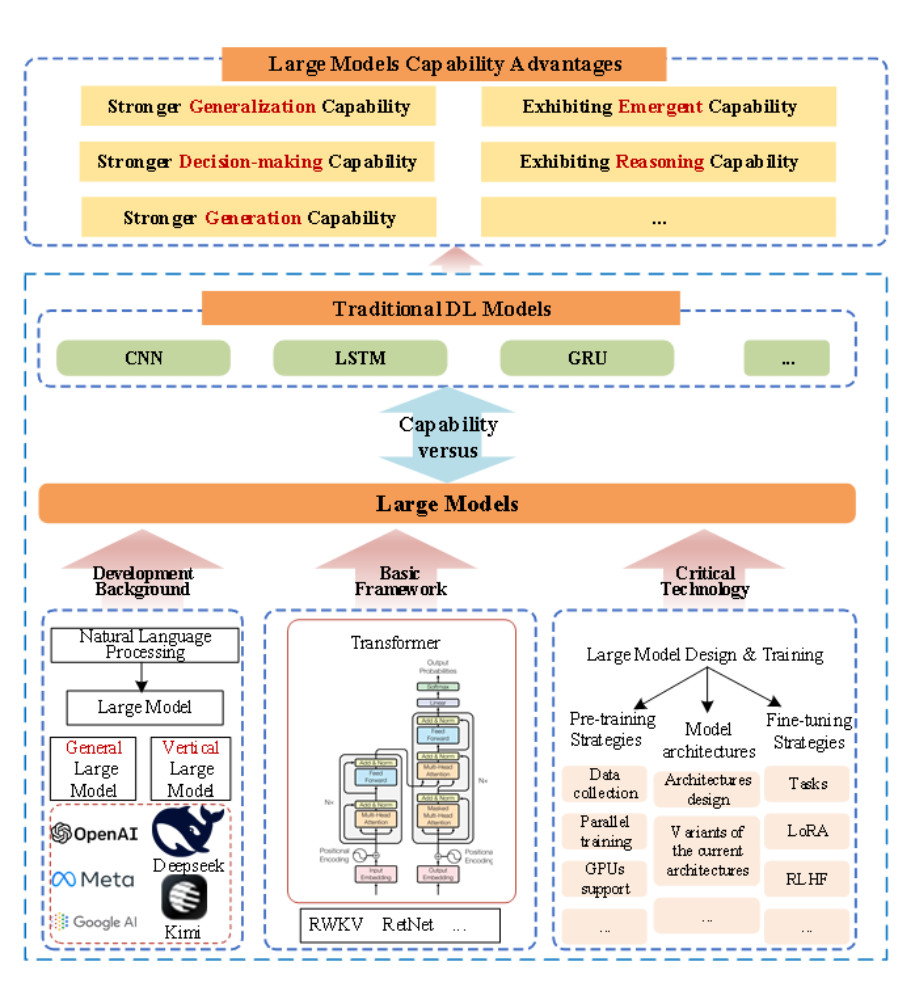 传统的深度学习是针对某一个具体的任务来设计模型以解决问题,而大模型则是利用海量数据进行预训练,再根据特定的下游任务进行微调,进而可以适应大部分的任务。随着大模型参数规模的增大到某一个阈值,大模型对某些问题的处理能力呈现快速增长的趋势,即出现了涌现性(Emergent Abilities)。因此,相较于传统的深度学习模型,大模型能够在训练中产生意料之外的新能力,具备涌现能力,这为处理一些复杂任务提供了契机。