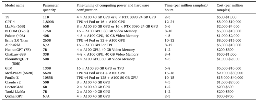 通过调查,进一步梳理了主流大模型的计算能力,及所需成本、时间等,如表3.2所示。