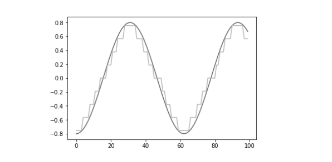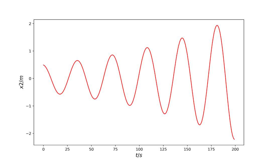 实际上,物理方程描述的是一个在时间上连续的系统,而Python脚本描述的是一个具有离散时间步长的系统,图4展示了实际力(曲线)和用于数值计算的力(阶梯线)。在 附近,由于曲线趋于将阶梯线一分为二,因此数值模拟产生的误差不大。误差是两条曲线之间的面积,且曲线上下两侧的面积大致相等。在顶部和底部峰值处,计算力并不能模拟实际的力。因此,精度损失会逐渐累积。