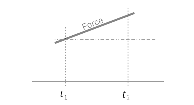 考虑图3所示的一个时间步长 。存在两个时间点 和 。粗线表示弹簧的内力。在此期间,小车正在移动,弹簧内力也随之变化。加速度与力直接相关,因此随着力的变化,加速度也会变化。然而,在同一时间段内,Python脚本使用的是 时刻的弹簧内力计算了加速度的值,并在整个时间步长内使用该值。在代码中,加速度和力在整个时间步长内保持不变。因此,数值模拟中的力不是图3所示的曲线,而是一条直线(如虚线所示)。