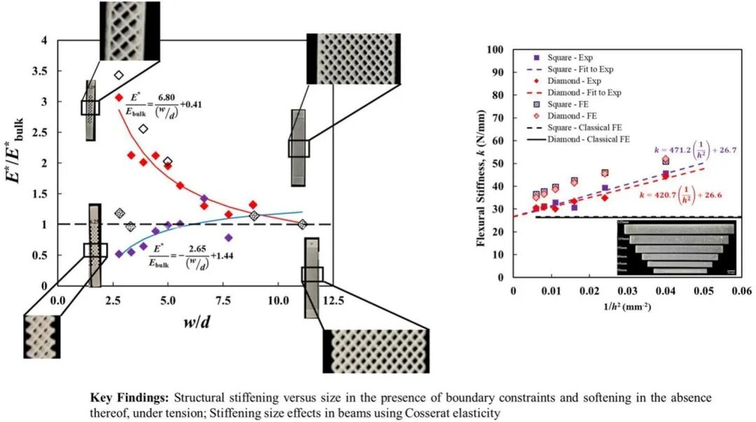有限细胞结构的尺寸效应研究相对来说还未被探索,特别是在张力结构中。在这项研究中,我们研究了3D打印晶格结构在单轴拉伸和弯曲下的尺寸依赖性力学行为。在拉伸作用下,实体边界墙约束的存在和不存在会产生不同的结构响应:边界约束的样品随着尺寸的减小而产生显著的硬化,而无约束的样品则表现出软化。这是由于边界壁面施加的局部旋转约束。向壁中添加材料对结构刚度的贡献不超过20% %,在相同的细胞大小和壁厚下缩小样本量,结构刚度增加了~ 200 %。与分析预测相比,无壁样品在张力下对厚度与细胞长度比(t/L)的有效模量响应也更为敏感。 在弯曲过程中,作为连续体处理的晶格梁表现出强烈的Cosserat尺寸效应,在2 mm至5 mm的样品细胞尺寸范围内,正方形和菱形(正方形旋转45°)拓扑结构的特征长度分别为4.2 mm和4 mm。重要的是,蜂窝拓扑并不妨碍Cosserat的适用性和解释。