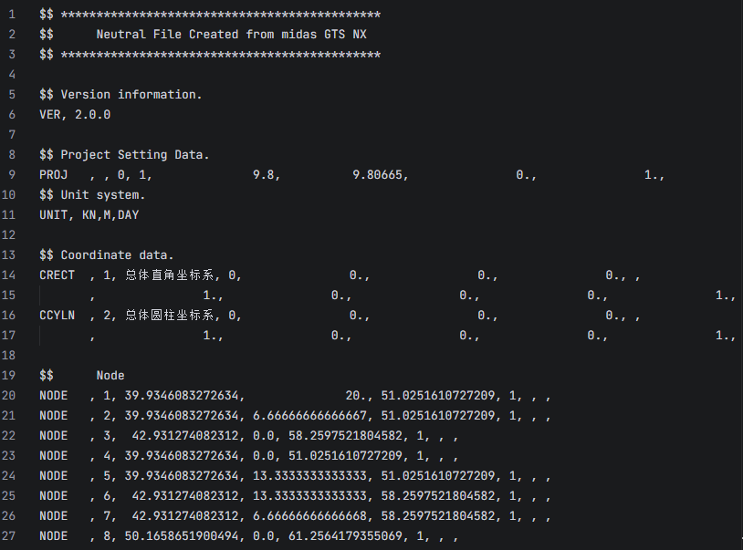 若用户没有NFX软件,那就需要自己根据导出的inp文件转换为MIDAS GTS能识别的网格文件,格式为fpn。之前在公 众号上分享过FPN文件的具体格式,链接如下。一般我们只需要知道不同软件中,节点,单元和网格组分组信息,就能够手动处理或者编程处理出我们想要的目标软件的网格文件。