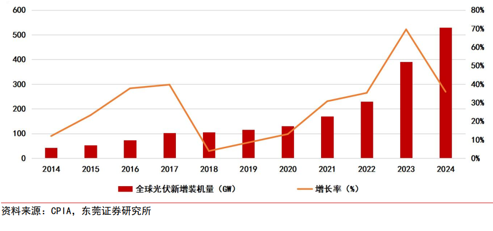 受全球能源体系加快向低碳化转型的影响, 以及能源战略安全性的需求, 可再生能源规模化运用与常规能源的清洁低碳化将成为能源发展的大趋势。 全球范围内, 光伏等可再生能源相关政策也广泛出台。 经过多年发展, 光伏发电已逐步实现平价上网, 降本增效路径清晰明确, 经济性凸显, 推动新增装机量高速增长。 根据 CPIA 数据, 2024 年全球光伏新增装机容量约 530GW, 较上年增长 35.90%。