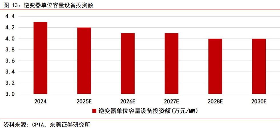 逆变器单位容量设备投资额指从锡膏印刷到组装以及包装环节所用生产设备所需的投资成本。 根据 CPIA, 逆变器设备投资成本由 2021 的 6.0 万元/MW 下降到 2024 年的4.3 万元/MW, 降幅达 28.3%。 未来随着逆变器功率密度的提升和自动化水平的提高, 以及市场需求的增加使得产线利用率有所提升, 都将使单位容量设备投资额呈下降趋势,预计 2030 年可降低至 4.0 万元/MW。