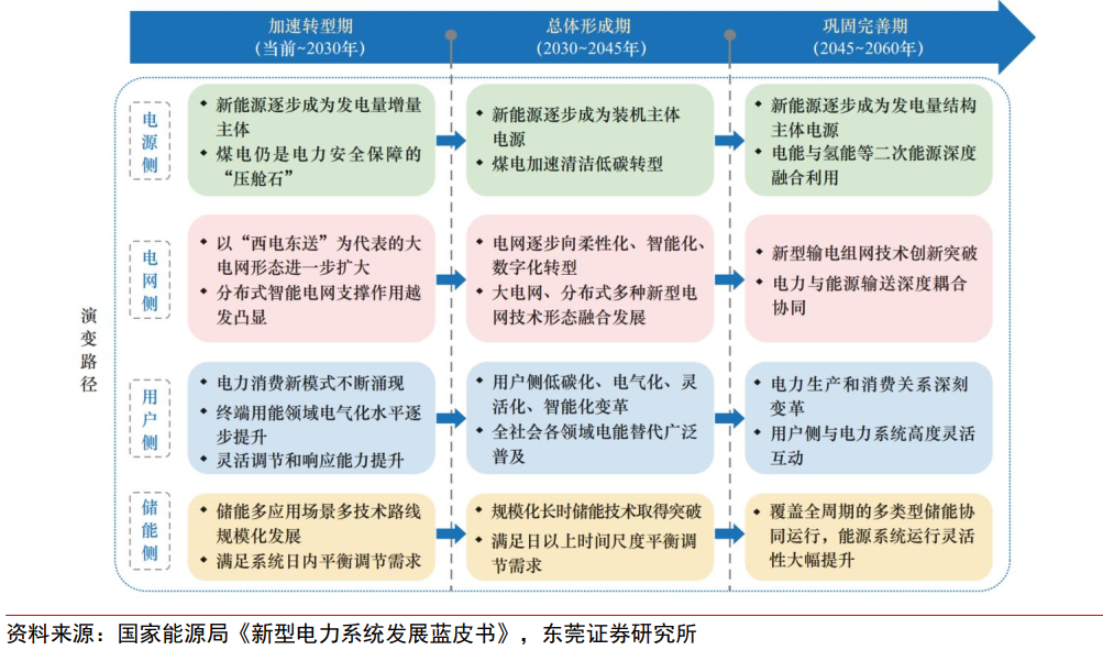 2023 年 6 月 2 日, 国家能源局发布《新型电力系统发展蓝皮书》 , 制定新型电力系统“三步走” 发展路径。 在加速转型期, 即当前至 2030 年, 新能源将逐步成为发电量的增量主体。