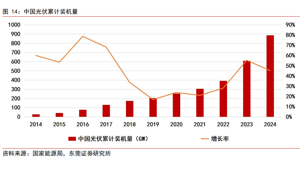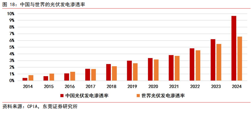 根据 CPIA, 中国的光伏发电渗透率从 2014 的 0.4%逐年增长至 2024 年的 9.8%, 超越了世界平均水平。 相比之下, 欧洲多个经济体的光伏发电渗透率超过 10%, 且电网仍保持稳定。 其中, 德国和意大利的光伏发电渗透率约 12%, 荷兰和西班牙的光伏发电渗透率则超过 16%。 随着我国加快推进新能源配套电网项目建设, 国内特高压输电网络不断完善, 分布式新能源承载力持续提升, 我国未来仍具备承载更多光伏发电的潜力。