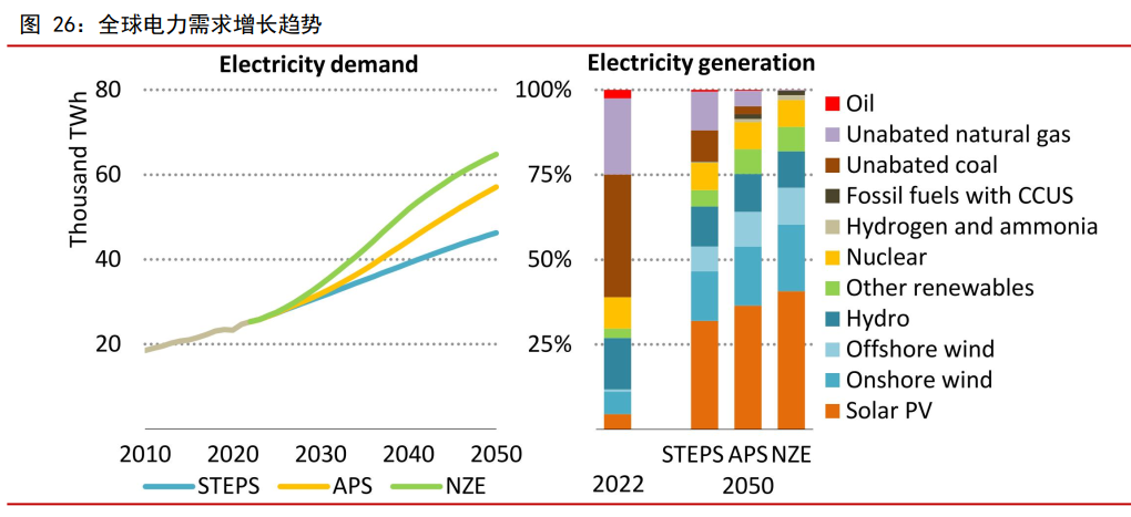 随着全球人口和收入的增长及电气化终端用户的增多, 未来全球电力需求在各个情景下都将迅速增长。 到 2050 年, 在 STEPS 中, 电力需求将从目前的水平增长 80%以上,在 APS 中增长 120%, 在 NZE 情景中则增长 150%, 且全球新增的电力需求将更多由低排放电力来源满足, 如太阳能、 风电、 氢气等。 2022 年至 2050 年, 在 STEPS 情景中, 化石燃料的份额急剧下降, 其电力总产量比重下降了三分之一以上, 在 APS 情景中下降了四分之三, 在 NZE 情景中下降了近 100%。